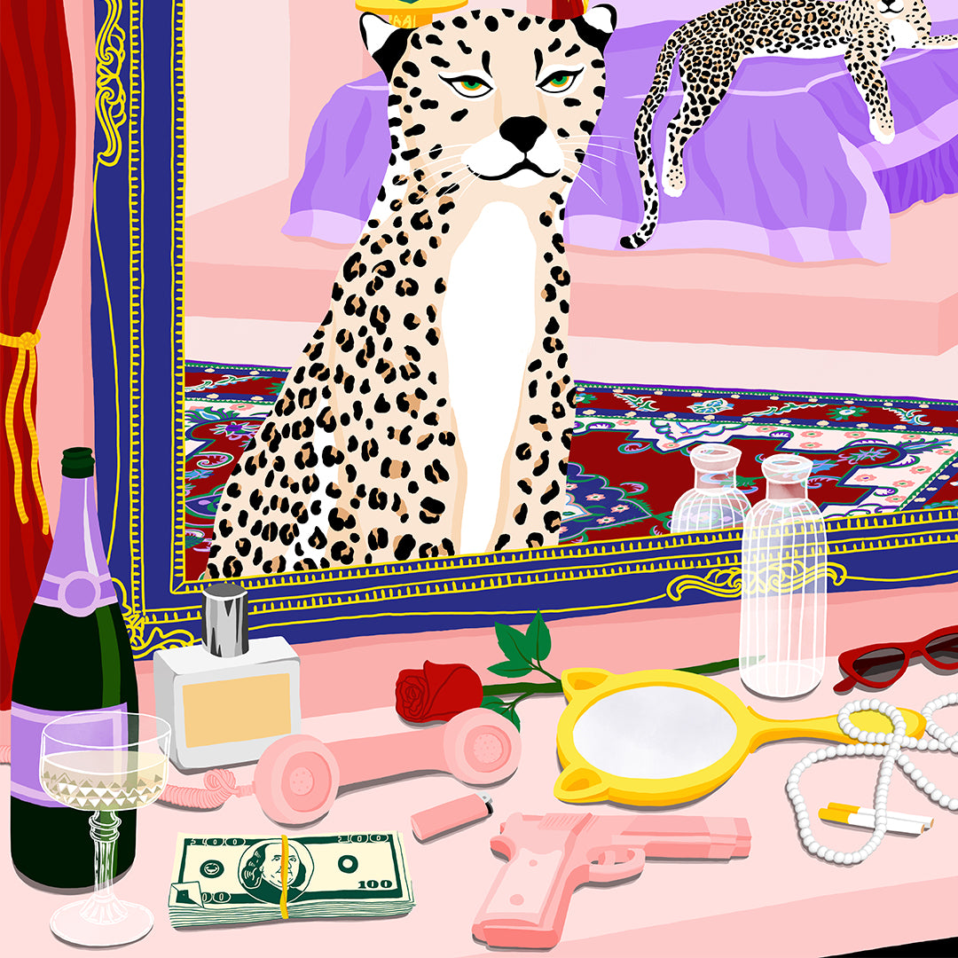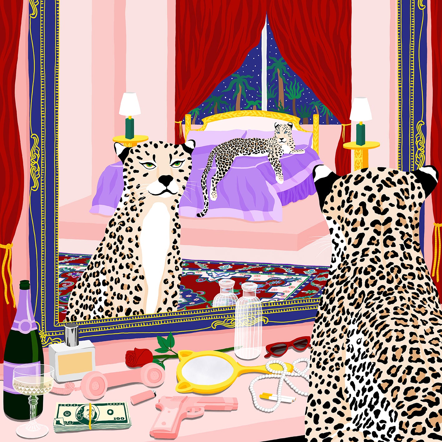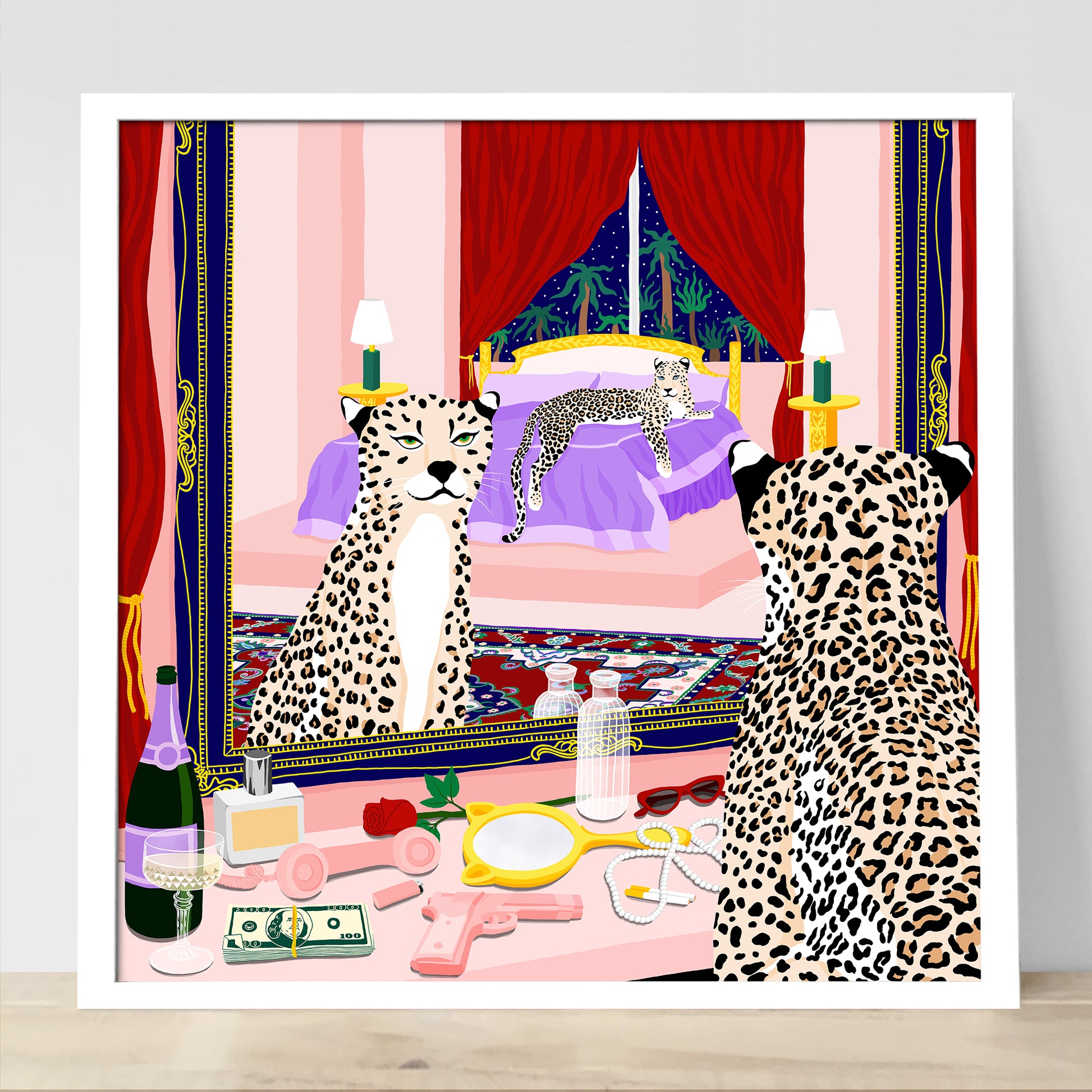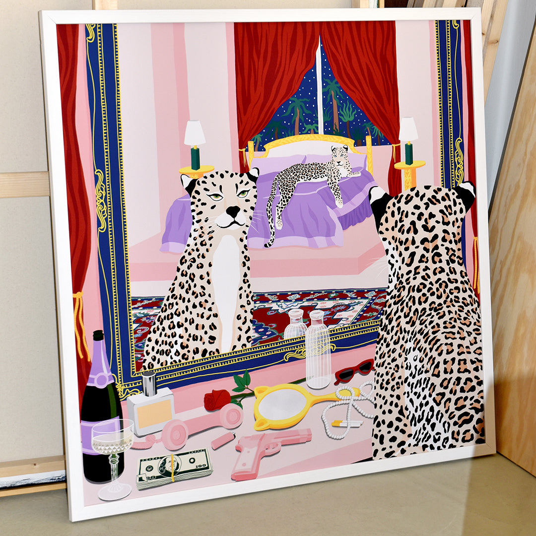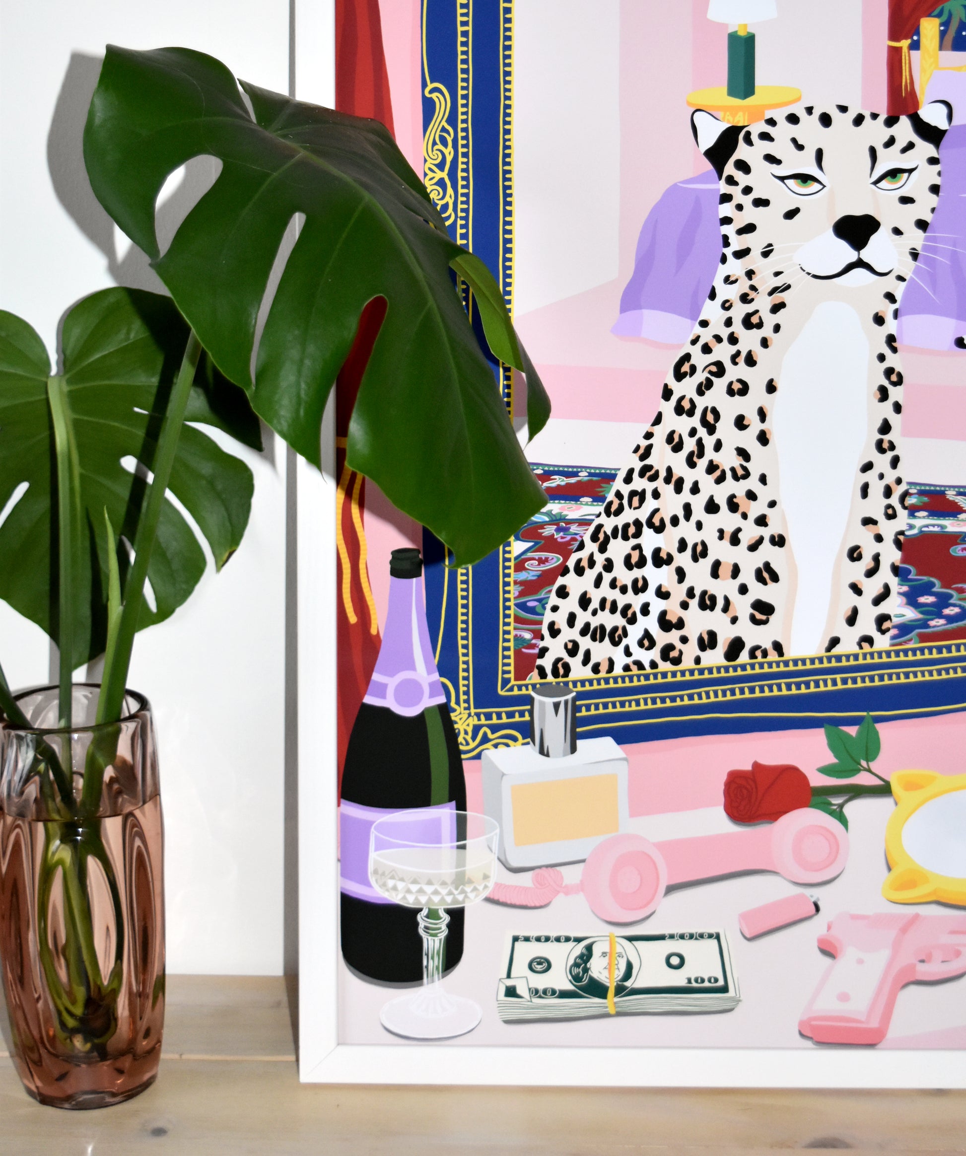 Bonafyde is a glimpse into the extravagant, grandiose and beautiful home of two leopards just living their life to the fullest with a little extra flavor. The print is a high quality art print, made in Stockholm on a matte coated 180 gsm paper, for best possible color result. The print is signed by hand, on the back, by the artist and you can choose from a variety of sizes.
