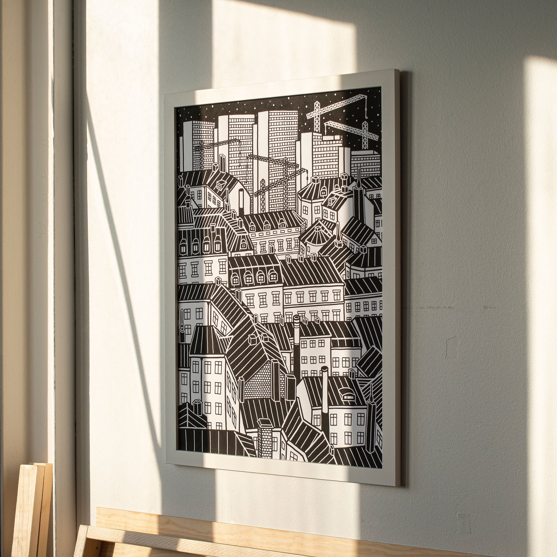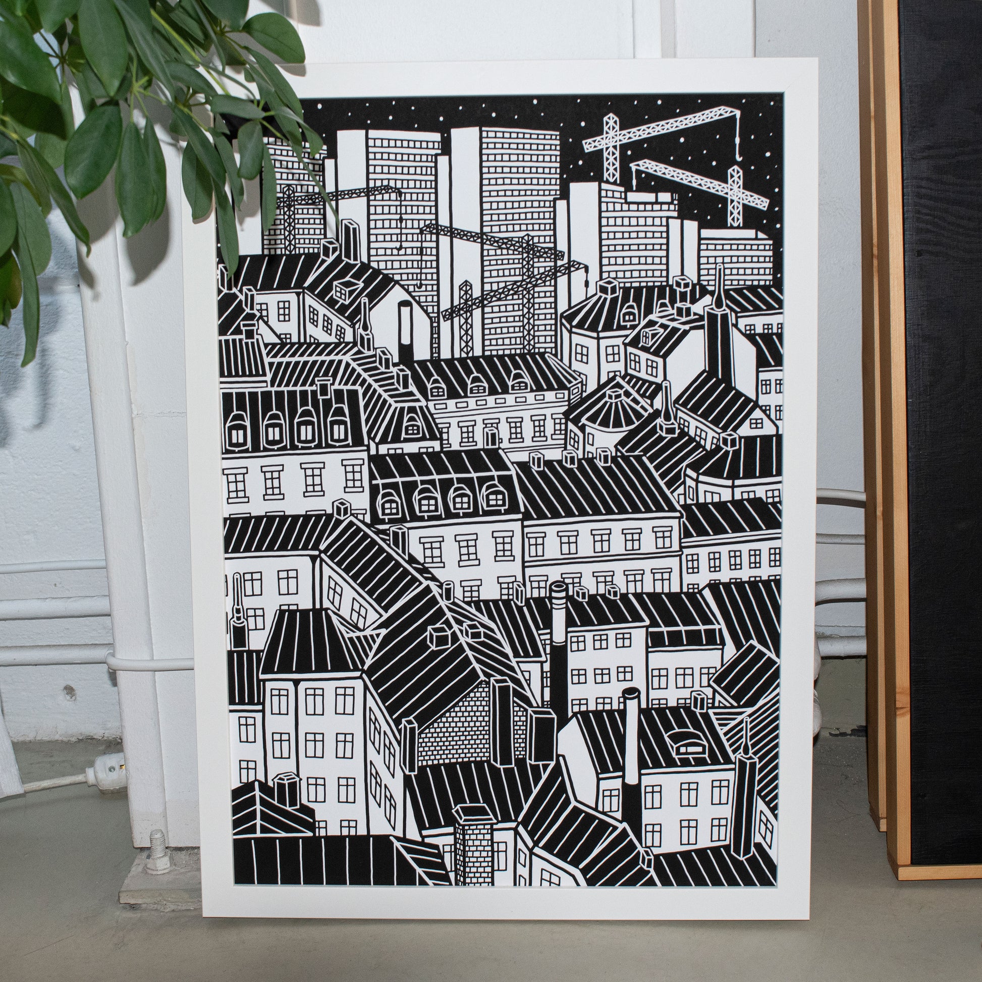 Beautiful Stockholm city rooftops, under a starry night sky. An artwork in black and white with great details. The print is a high quality art print, made in Stockholm on a matte-coated 180 gsm paper, for the best possible color result. The print is signed by hand, on the back, by the artist and you can choose from a variety of sizes.