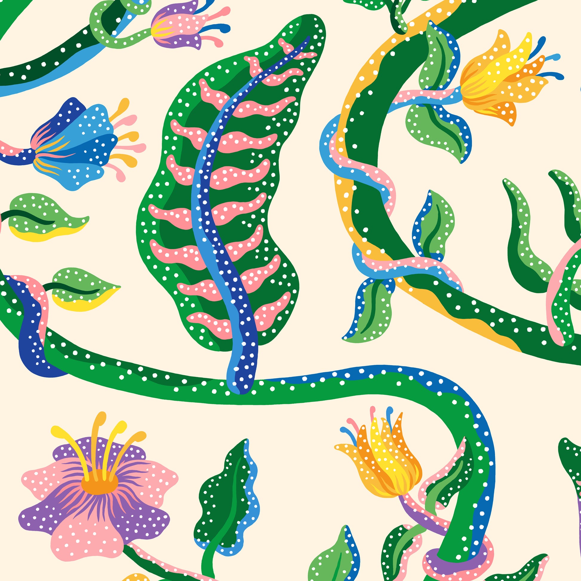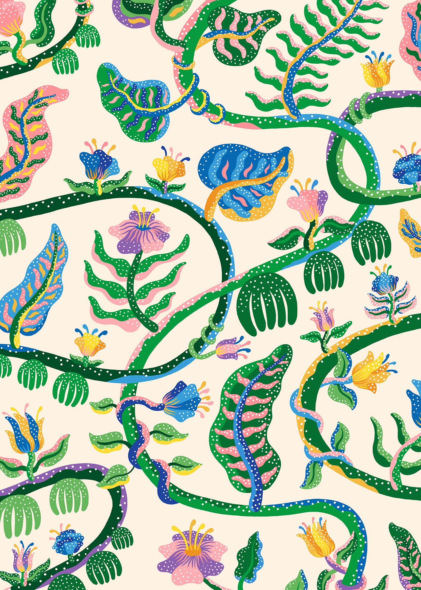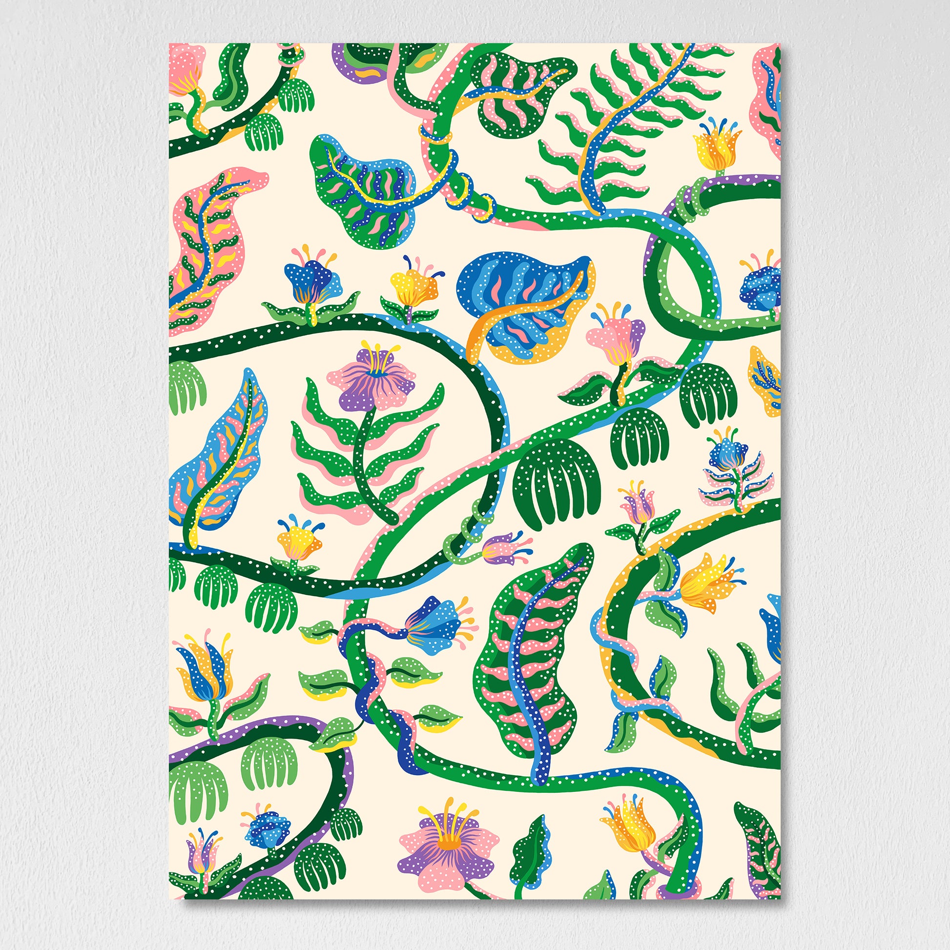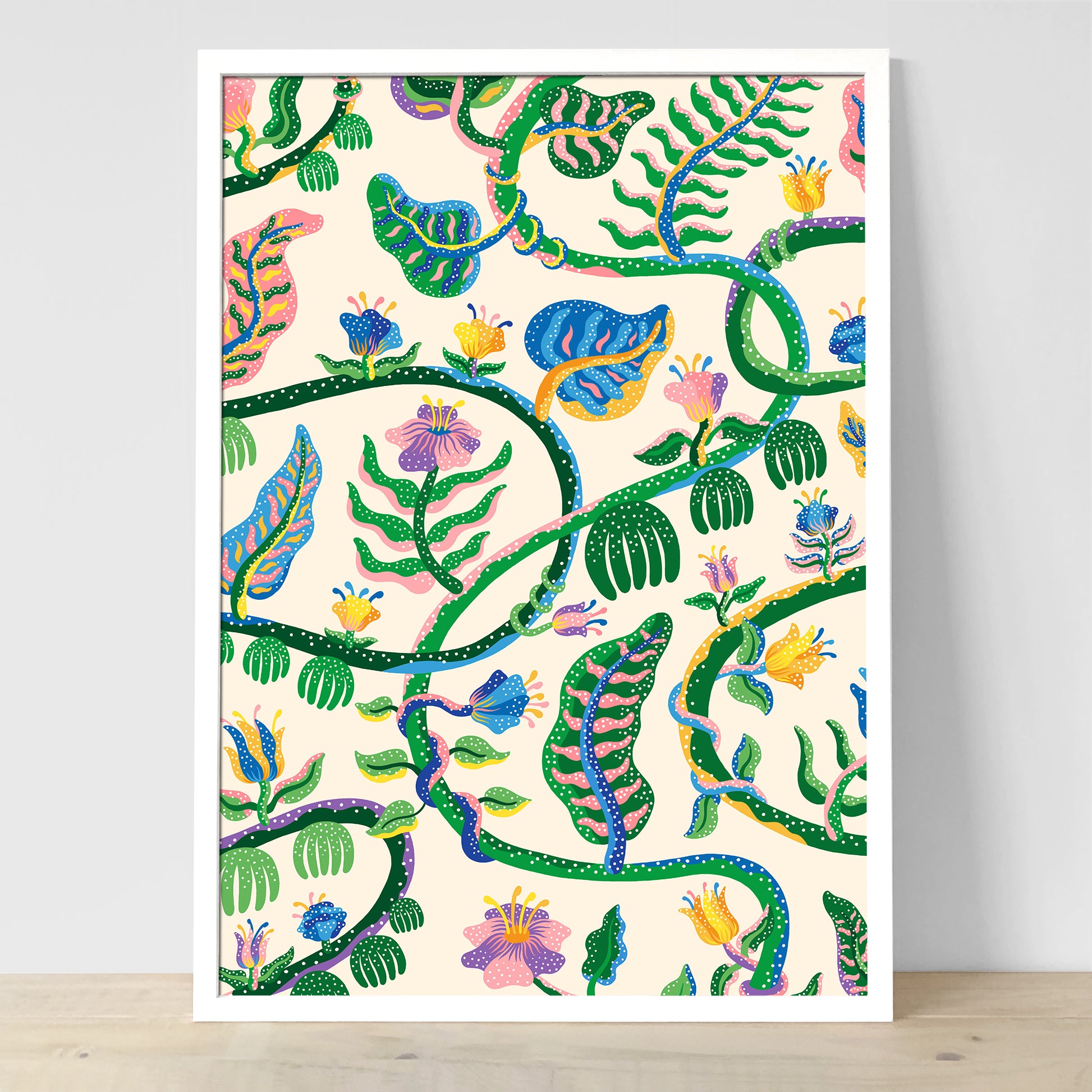 Lianer med färgglada blommor och blad, det här exotiska konstverket har vackra färger, många detaljer och är skapat på en benvit bakgrund. Ett högkvalitativt konsttryck, tillverkat i Stockholm på matt bestruket 172g papper, för bästa möjliga färgresultat. Printet är signerad för hand på baksidan och du kan välja mellan två storlekar.